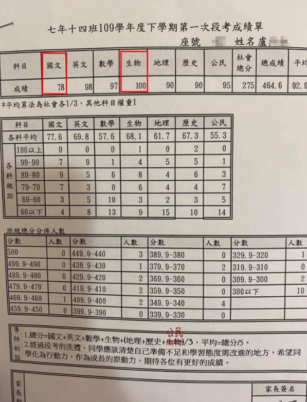 1名家長在臉書貼出就讀國中1年級的女兒第1次段考成績單,這名家長說,國文老師先前罵過女兒「朽木不可雕也」,女兒就用段考分數回罵老師。網友看了驚嘆「天才」。